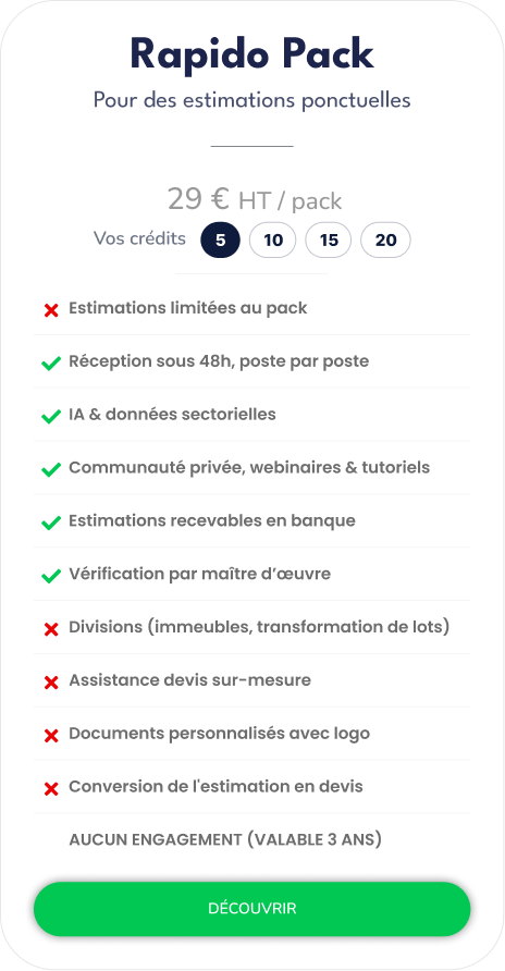 Le Rapido Pack permet d'estimer montant travaux via un système de crédits valables 3 ans, sans frais fixes, idéal pour une estimation travaux appartement.